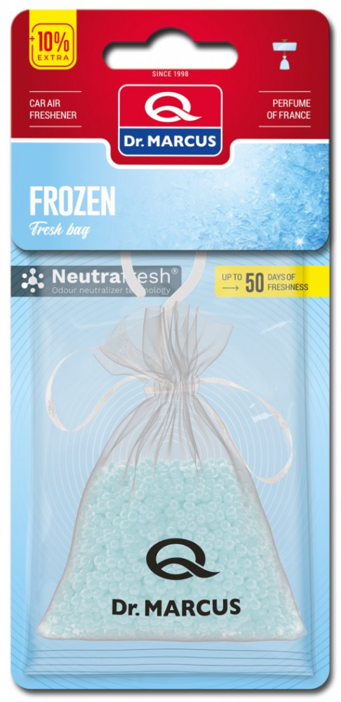 Dr. Marcus Fresh Bag Frozen autóillatosító (új néven Winter Ice) kis golyó formába öntve, zsákba csomagolva, ez a Fresh bag. Divatos egyedi formatervezés, kellemes illatkompozícióval párosítva. Ideális útitárs, mely kényezteti érzékeit az autóban töltött idő alatt.