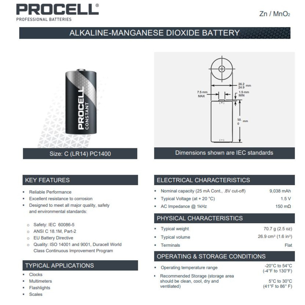 Duracell Procell PC1400 C baby elem professzionális eszközökhöz tervezett általános célú alkáli ipari elem, vállalatok és közületek részére. Ha nagy mennyiségben vásárol Procell alkáli elemeket, akkor olyan teljesítményprofilt keres, amely megbízhatóan kezeli az állandó használat nehézségeit, miközben hosszú élettartamot is biztosít. A Procell alkáli elemek beváltják ezt az ígéretet, többek között a következő jellemzőkkel:
