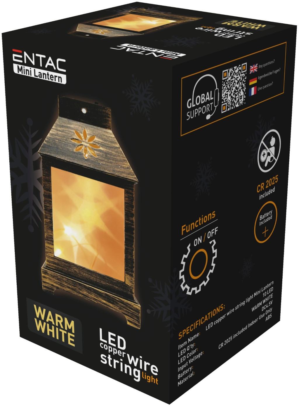 Az Entac LED Mini Lámpás egy elegáns, bronz színű dekoráció, amely kiválóan illik bármely beltéri karácsonyi díszítéshez. A lámpás belsejében réz huzalon elhelyezett LED-ek meleg fehér fénnyel világítanak, varázslatos és meghitt hangulatot teremtve. Kompakt, 12 cm-es méretének köszönhetően bárhol elhelyezhető. A lámpához tartozó CR2025 elem biztosítja a hosszú üzemidőt, így nem szükséges külön áramforrás.