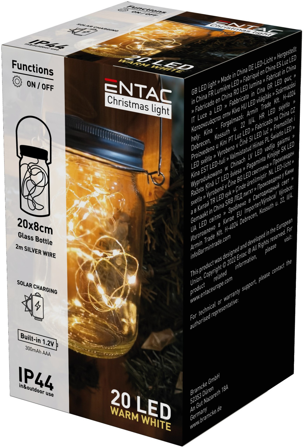Az Entac napelemes üvegfény elegáns és praktikus dekoráció, amely tökéletes választás minden ünnepi vagy kültéri eseményhez. Ez a 20 LED-es meleg fehér fényfüzér beépített napelemmel és 1.2V, 300mAh AAA akkumulátorral rendelkezik, amely a nap energiáját használva világít. Az IP44-es védettségének köszönhetően ellenáll a nedvességnek és időjárási viszontagságoknak, így beltéri és kültéri használatra is ideális. Az üvegfény 20 cm magas és 8 cm széles, ezüst drótvezetéken elhelyezett LED-ekkel varázsolja ünnepivé a hangulatot.