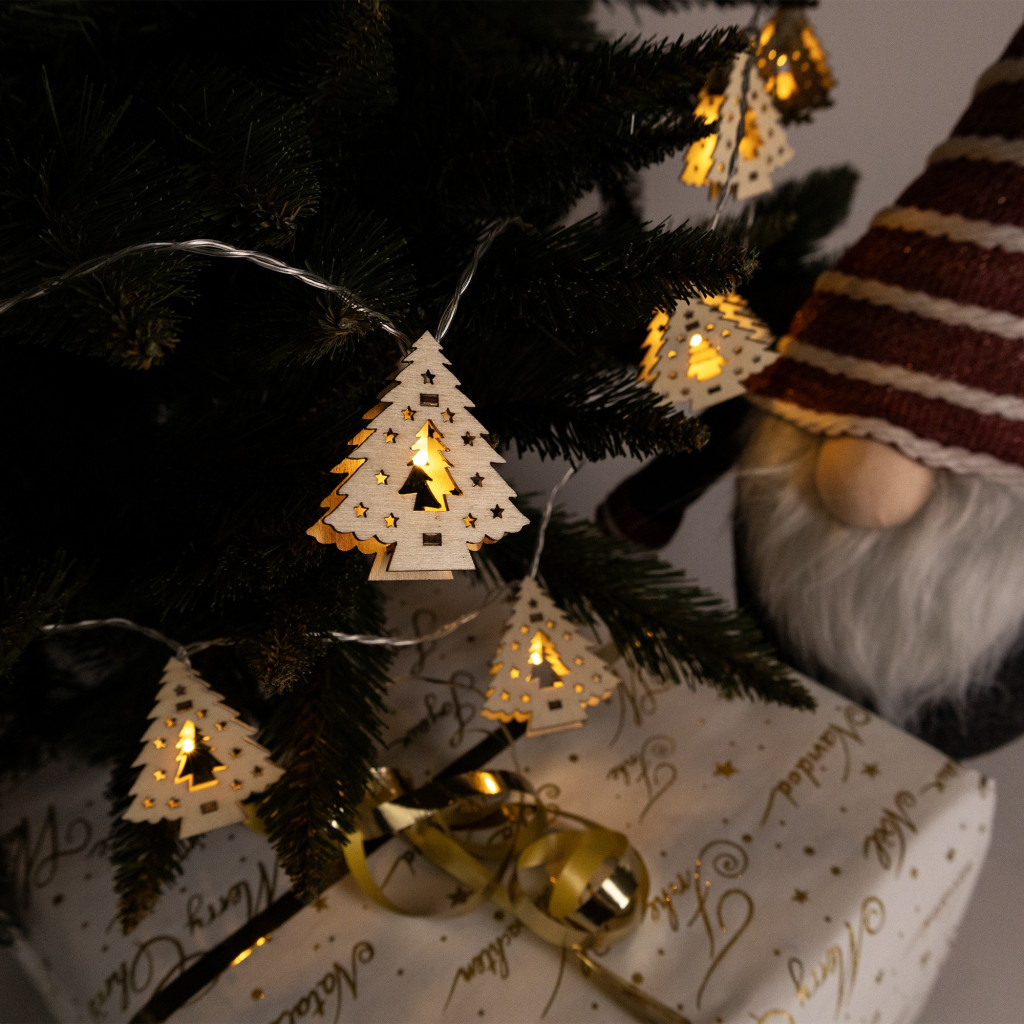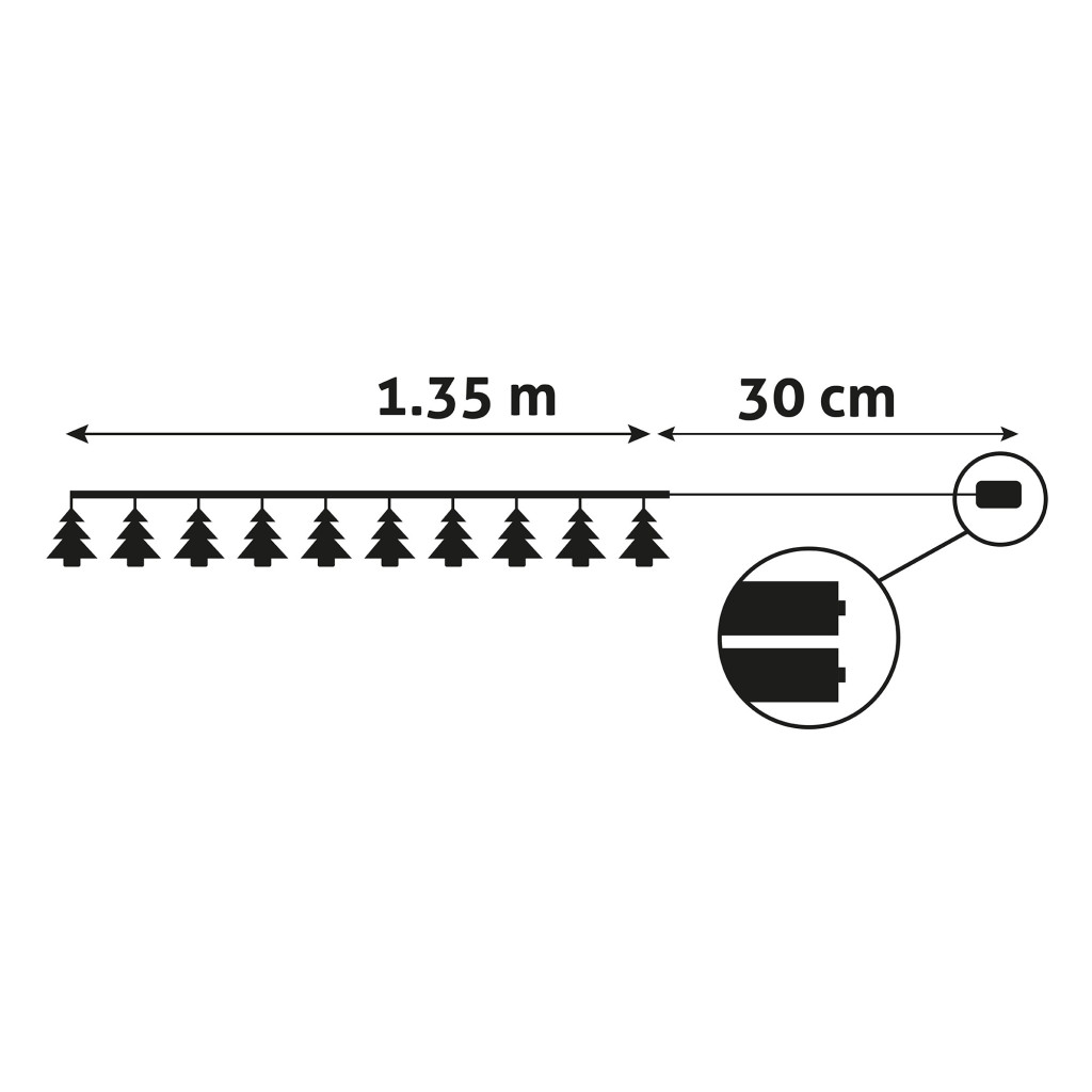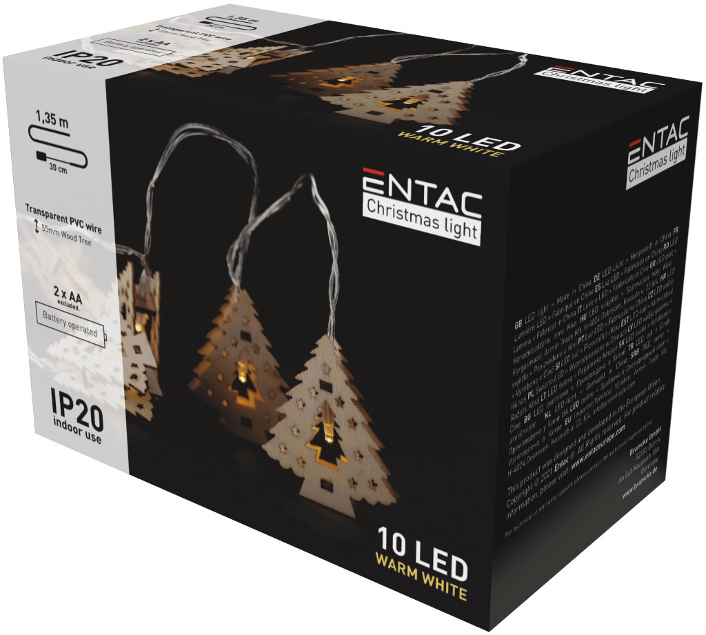 Díszítse otthonát a karácsony hangulatával ezzel az Entac beltéri karácsonyfa füzérrel. A füzéren 10 fa karácsonyfa alak található, amelyek meleg fehér LED fényekkel ragyognak. A 1,65 méter hosszú, átlátszó PVC vezetékkel ellátott füzér ideális ablakok, polcok vagy a karácsonyfa dekorálására. Elemmel működik, így bárhol könnyen használható, ahol nincs elérhető konnektor.