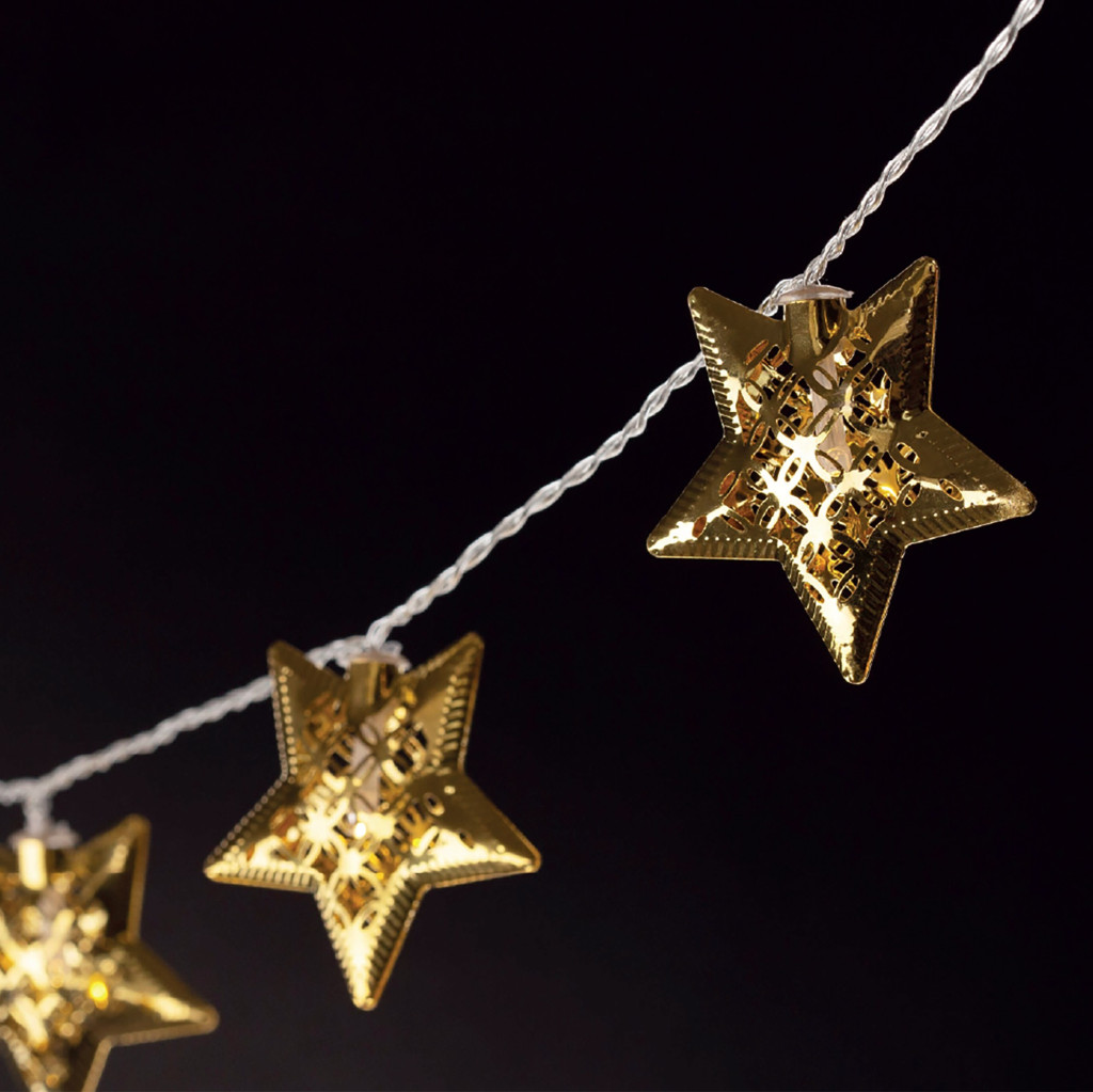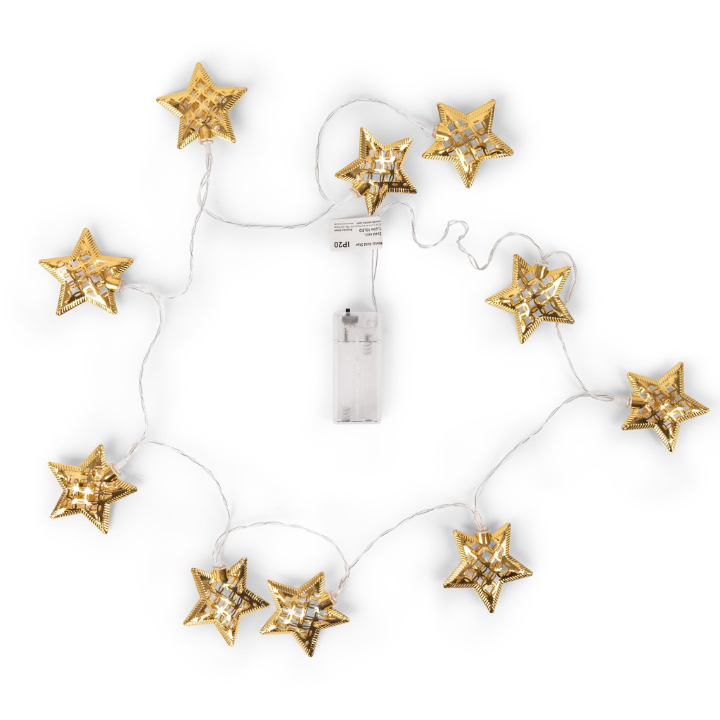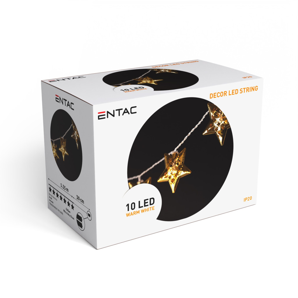 Díszítse otthonát az ünnepi hangulathoz illő, elegáns Entac fényfüzérrel, amely 10 meleg fehér LED-del világító fém arany csillagokat tartalmaz. A füzér átlátszó PVC vezetékkel és 1,65 méteres hosszúsággal rendelkezik, ideális beltéri dekorációhoz. Az elemes működésnek köszönhetően könnyedén elhelyezhető bárhol anélkül, hogy konnektort kellene keresnie. Tökéletes választás karácsonyi dekorációkhoz, legyen szó ünnepi asztalról, ablakokról vagy polcokról.