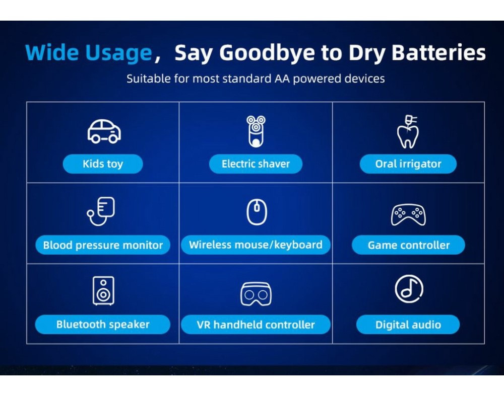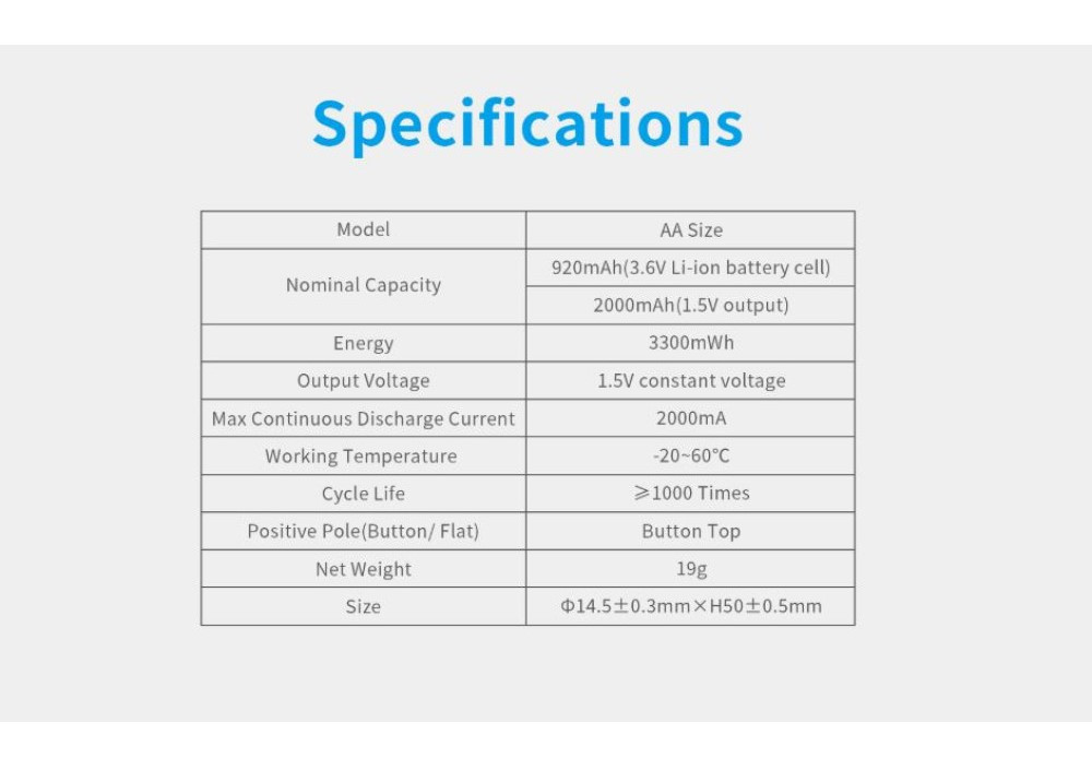 Fontos tudnivaló: ez Li-ion technológiájú, 1,5V-os kimenetű AA akkumulátor, ezért töltéshez Li-ion akkukhoz való, kifejezetten 1,5V-os Li-ion AA/14500 támogatással rendelkező töltő szükséges. A kizárólag NiMH (1,2V) töltők ehhez nem megfelelőek.