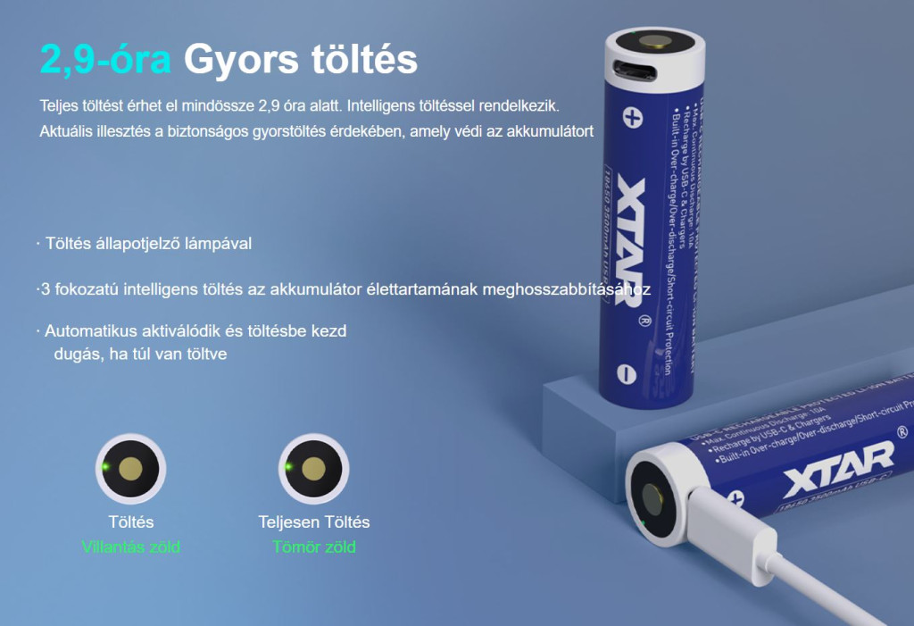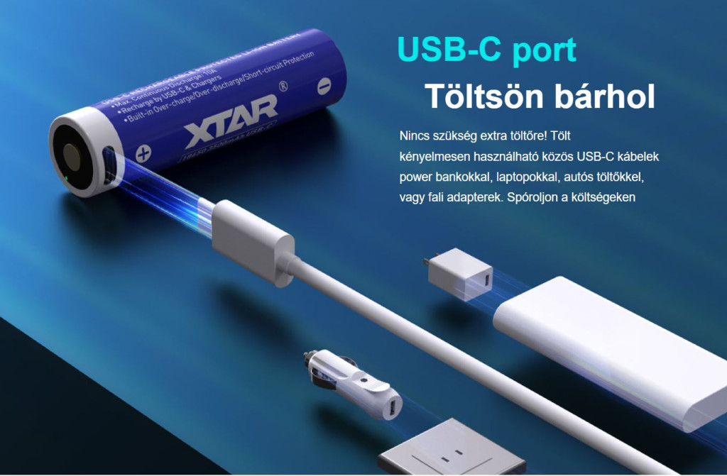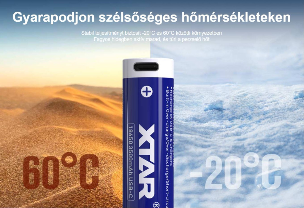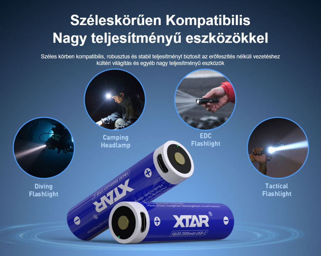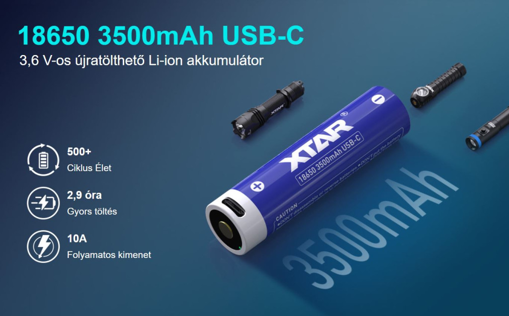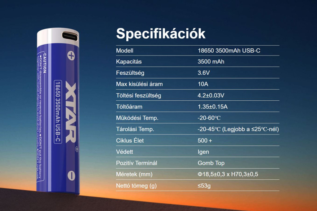 Az XTAR 18650 USB-C 3500 mAh egy lítium-ion (Li-ion) újratölthető akkumulátor, amely ideális lehet kompatibilis 18650-es eszközökbe (pl. erősebb lámpákba, hordozható eszközökbe, tartalék akkuként). A 3,6V névleges feszültség a működés közbeni átlagos értéket jelzi (a piacon gyakran 3,7V-ként is hivatkoznak a hasonló Li-ion cellákra).