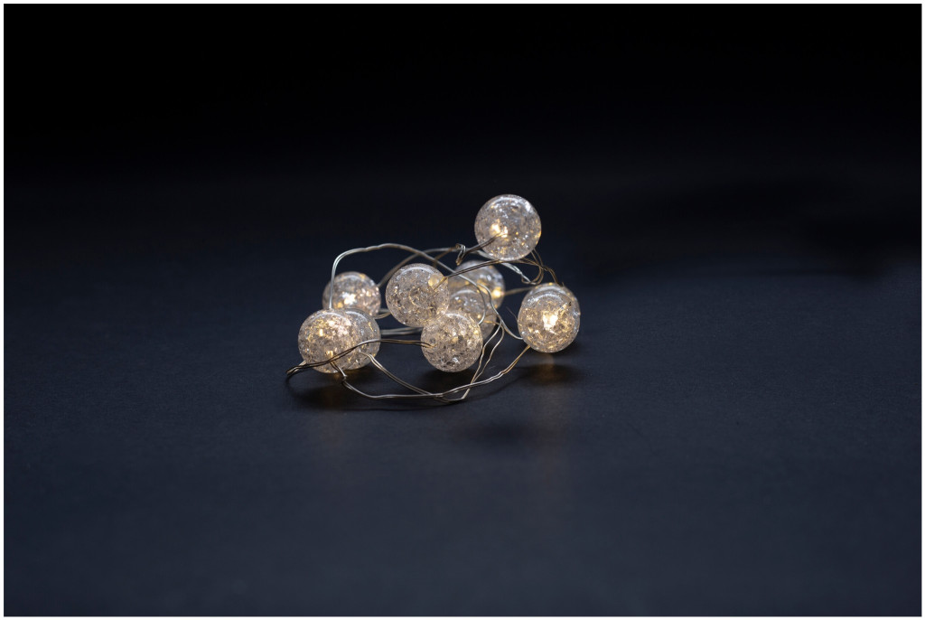 - 10 áttetsző műanyag golyó, meleg fehér LED-ekkel
