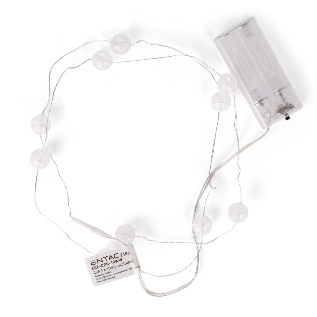 Az Entac karácsonyi beltéri fényfüzér elegáns áttetsző műanyag golyóival modern és hangulatos dekorációt kínál otthonába. A 1,3 méter hosszúságú, ezüst színű drótkábellel rendelkező fényfüzér 10 meleg fehér LED-et tartalmaz, amelyek lágy és kellemes fényt sugároznak. Az IP20 védelemmel ellátott fényfüzér kizárólag beltéri használatra készült. A rugalmas drót könnyen formázható, így számos dekorációs lehetőséget kínál az ünnepi díszítéshez. A fényfüzér 2 db AA elemmel működik (nem tartozék), így egyszerűen elhelyezhető a lakás különböző pontjain.
