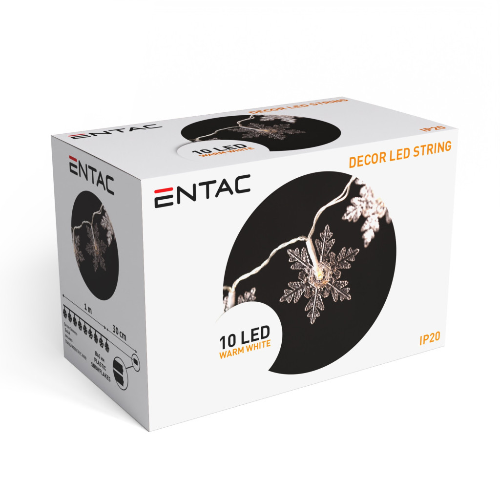 Az Entac karácsonyi beltéri fényfüzér gyönyörű hópehely alakú díszeivel igazi téli csodát varázsol otthonába. A fényfüzér 1,3 méter hosszú, átlátszó PVC kábellel rendelkezik, amely diszkrét megjelenést biztosít. A 10 meleg fehér LED lágy, kellemes fényt sugároz a hópelyhek körül, és ünnepi hangulatot teremt. Az IP20 védelemmel ellátott fényfüzér kizárólag beltéri használatra alkalmas, és 2 db AA elemmel működik (nem tartozék), így szabadon elhelyezhető a lakás bármely pontján, legyen szó karácsonyfáról, ablakokról vagy polcokról.