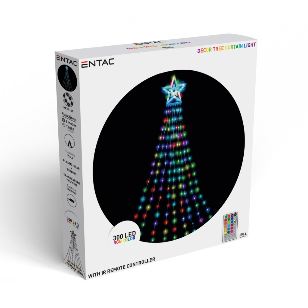 Az Entac karácsonyfa takaró fényfüggöny 300 RGB mikro LED-et tartalmaz, melyek színváltós fényükkel dinamikus és látványos díszvilágítást biztosítanak. A többszínű LED-ek piros, zöld, kék és sárga árnyalataival igazi ünnepi fényáradatot teremtenek.