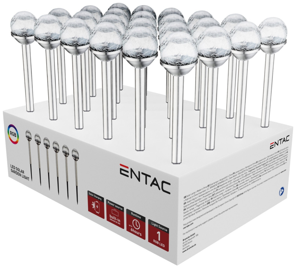 Az Entac rozsdamentes acél kerti szolár lámpa üveg fejjel és színes RGB LED-del modern, mégis klasszikus megjelenést kínál bármely kültéri környezethez. A 340 mm magas lámpa különlegességét a mintázott, edzett üvegből készült búra adja, amely a színes világítással együtt különösen látványos fényhatást biztosít.