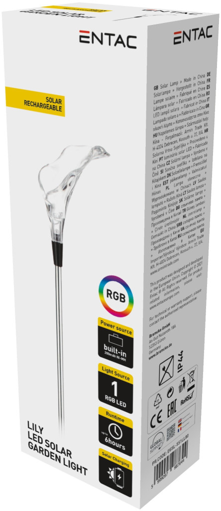 Az Entac 340 mm magas kerti szolár lámpa káprázatos kála virágformájával természetes eleganciát kölcsönöz kertednek vagy teraszodnak. A rozsdamentes acél szár biztosítja a strapabíró szerkezetet, míg a beépített napelem napközben feltölti az akkumulátort, hogy sötétedéskor automatikusan bekapcsoljon.